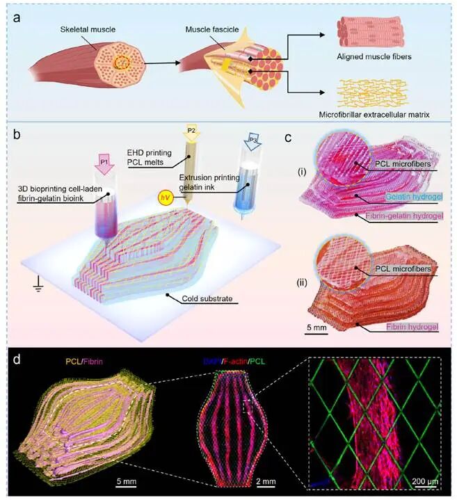 骨骼肌具有高度束状取向与显著力学各向异性,大体积肌缺损临床多依赖自体移植,来源有限且功能重建不理想。传统挤出/光固化打印难以在厘米尺度同时实现孔隙有序、力学支撑与细胞高取向,且构建体易整体收缩,限制肌管成熟与功能化。为破解“结构—力学—细胞”三难题,该研究提出将EHD微纤维打印与挤出式生物打印连续耦合的CHB策略,在动态导电集电面上协同沉积PCL微纤维、牺牲模板与载细胞纤维蛋白,兼顾宏观高度、各向异性力学和微观取向诱导。该方法使构建体的纵/横向模量接近原生肌肉并显著促进肌生成,为解剖级肌组织制造与个体化再生治疗提供通用而高效的技术路径。