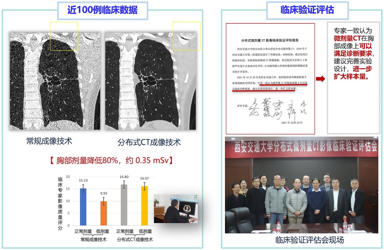 分布式微剂量CT技术经近百例临床验证,胸部剂量降低80%(约0.35 mSv),成像质量达到诊断要求,获得专家一致认可,临床评估认为该技术已具备应用条件
