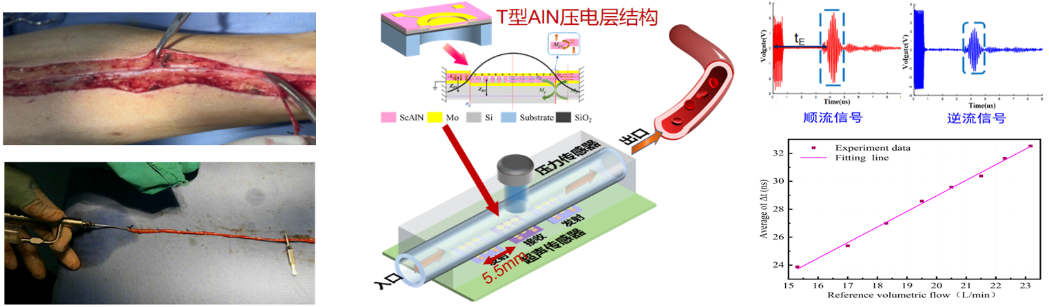 针对柔性管道组织在连续灌注过程中面临的腔内层流控制、恒定压力维持以及无污染扩张等关键技术难题提供了创新解决方案。研制的基于MEMS加工技术的柔性血管超声流量样机,已成功实现体外大隐静脉灌注液流体状态检测的实验验证,灌注液测量范围: 流量范围:0~0.2 L/min;量精度≤ 2%,柔性管超声流量传感器具有多项自主知识产权,通过MEMS加工技术制备微型化压电单元阵列,具有微型化、集成化、轻量化、低功耗等优势,实现PMUTs在体外柔性管上的微型化且具有生物兼容性的安装。