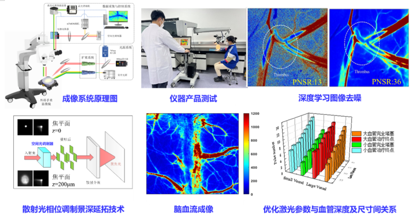 (1)高穿透深度、高信噪比激光散斑血流动力学测量技术:开发正交偏振图像增强技术,通过滤除浅层反射光有效提取携带深层信息的散射光,显著提高成像信噪比。构建基于深度学习算法的图像配准与降噪模型,重点研发轻量化扩张残差深度学习网络,解决复杂环境下的成像干扰问题。开发新型荧光粒子测速法,并结合基于“U-Net”架构的深度学习图像分割网络,实现对血管微环境的精准识别,达成对血流动力学变化及血栓形成的在线、精确、实时监控。