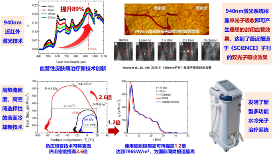 瞬态制冷剂闪蒸喷雾冷却辅助的940nm近红外波长血管性皮肤病治疗新技术:针对585/595nm脉冲染料激光黑色素吸收高、穿透深度浅,对增厚型血管性皮肤病无效,且传统喷雾冷却技术对黑色素含量较高的黄种人表皮冷保护不足的瓶颈问题,该项目发明了瞬态制冷剂闪蒸喷雾冷却辅助的940nm近红外波长血管性皮肤病治疗新技术并应用于广东吉士迪科技有限公司研制的多功能水冷光子治疗系统。传统的光子治疗系统采用较宽光谱500-1100nm 的高功率光源进行照射达到治疗效果,治疗技术瓶颈在于由于强光源包含可见光波段,因而造成表皮灼伤情况时有发生。基于该项目的940nm 近红外波长治疗新技术,新研制的多功能水冷光子治疗系统中滤去可见光波段并依据940nm激光治疗参数优化脉宽设置,采用多脉冲治疗模式极大降低了治疗入射激光能量,表面灼伤发生概率显著降低。发明的940nm 近红外波长治疗新技术应用于广东吉士迪科技有限公司的多功能水冷光子治疗仪,累计销售额700 万元。