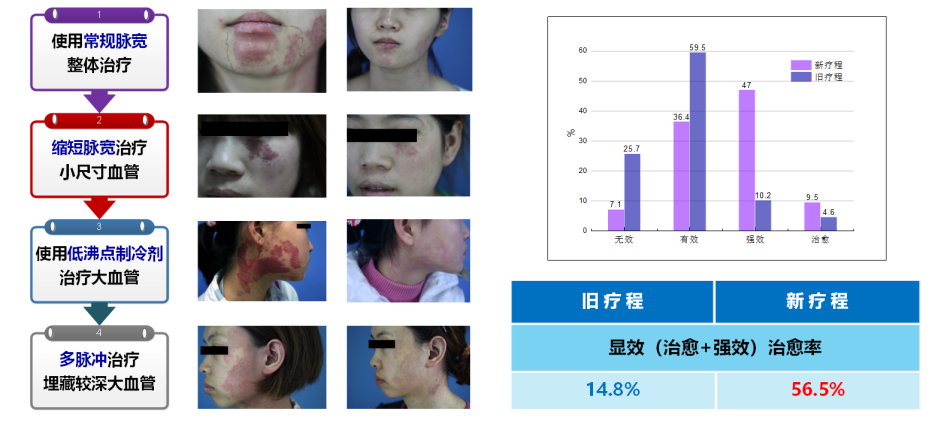 多脉冲时序优化分级治疗技术:针对传统585/595nm可见光脉冲染料激光单脉冲固定时序集总治疗方案效率低下的瓶颈问题,该项目发明了全新的多脉冲时序优化分级治疗技术。采用上述新技术在西安交通大学第二附属医院、陕西省皮防所医院共治疗鲜红斑痣患者3328 例,术后回访普遍反映临床效果好、复发率低。显效治愈率提高至56.5%,远高于国际报道最高水平(20%)。平均治疗次数降低2.9 次(由6.8次降至3.9 次),按单次治疗平均5000 元计节约治疗费用4825.6 万元,取得了显著的经济和社会效益。