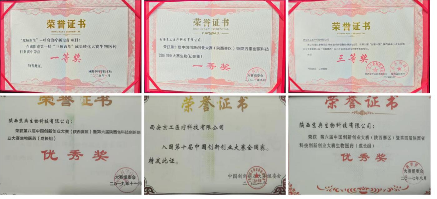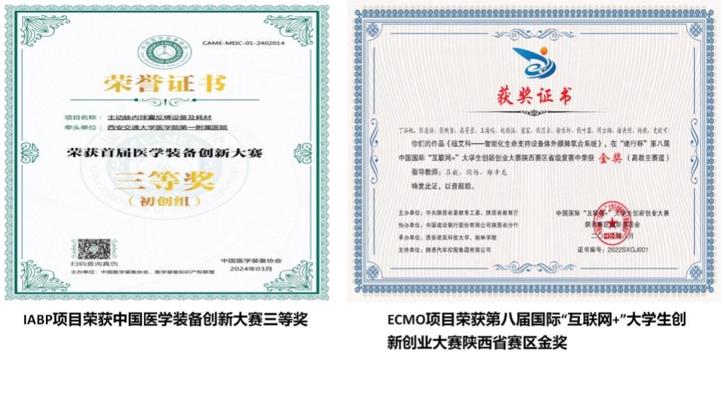 本团队研发的新型双囊IABP项目参与了首届医学装备创新大赛,并荣获全国三等奖,成为所有获奖单位中唯一专注于体外生命支持设备研发的团队。此外,由团队指导的学生项目在第八届中国国际“互联网+”大学生创新创业大赛中,荣获陕西省赛区金奖。