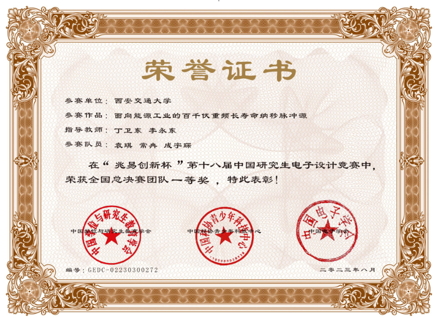 2023年获得第三届届全国大学生高电压与等离子体科技创新竞赛国家级一等奖