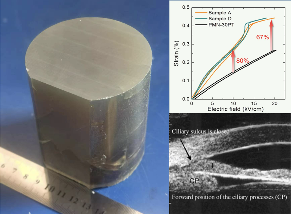 李飞教授团队所研发的Sm掺杂PMN-PT单晶是世界上压电性能最高的块体材料,纵向压电性能分别是传统压电陶瓷和单晶材料的8倍和2倍,同时,利用钐元素在晶体生长过程中的分凝特点,优化了单晶棒性能的均匀性。为高频医疗超声探头和高精度与大位移压电驱动器奠定了新的压电单晶材料基础。相关高性能器件正在研发中。