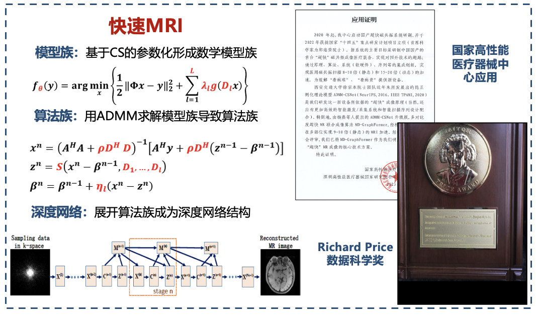 徐宗本院士团队针对MRI扫描耗时长的瓶颈,提出融合数学优化与深度学习的“隐正则化”成像框架,实现从先验建模到数据驱动的转变,显著提升复杂组织结构建模能力。基于此,团队研发出MD-GraphFormer超快MRI核心算法,被国家高性能医疗器械创新中心采纳,成功实现静态成像8-10、动态成像15-20加速,在保持高分辨率与诊断精度的同时,大幅缩短检查时间。该技术体系已在多家医疗机构验证并入选“中国医学人工智能代表性技术”,具备成熟的算法、系统与应用基础,为我国高性能MRI装备自主可控提供关键支撑。