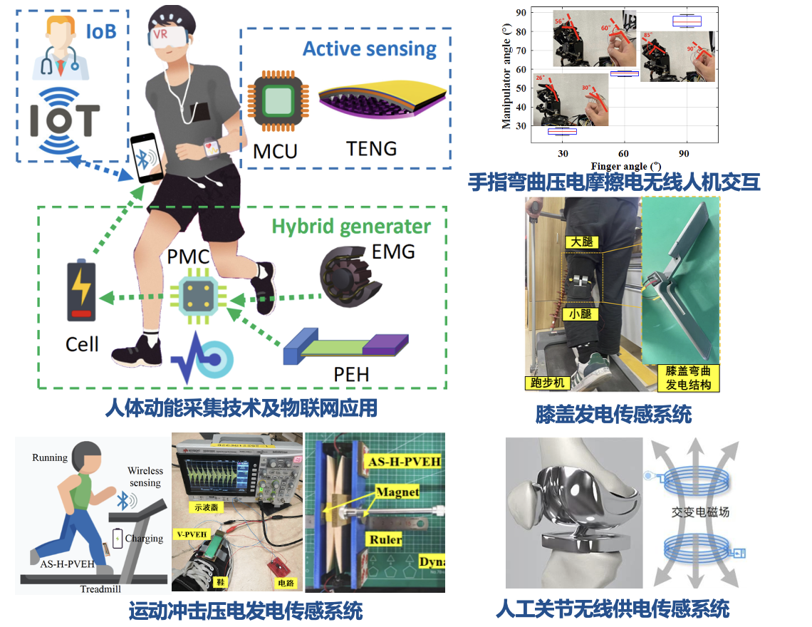 系统集成摩擦电、电磁、压电等多模态人体动能采集及自供电传感技术,构建能量采集、智能传感与物联交互架构。含手指弯曲压电摩擦电交互、膝盖发电传感、运动冲击压电发电、无线供电等子系统,可从肢体运动获能并感知状态。