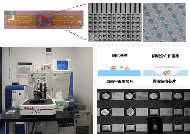 徐林峰教授团队利用带有微碗结构的质谱芯片将pL级液滴排列成规则二维阵列,既限制每个细胞于独立像素、避免串扰,又可原位完成裂解-萃取-质谱检测;配套的质谱成像工作站把显微与质谱坐标无缝映射,自动导入阵列坐标与白名单目标,联动MALDI采集,实现对阵列内单细胞的快速寻址、按点/按块精准采集与谱-像实时叠加回溯,并以边界质控点与内标完成漂移校正与强度归一化,构成“打印→稳态/处理→配准→成像→分析”的一体化闭环,用于单细胞代谢/脂质/药物等多组学的高通量、可追溯检测。