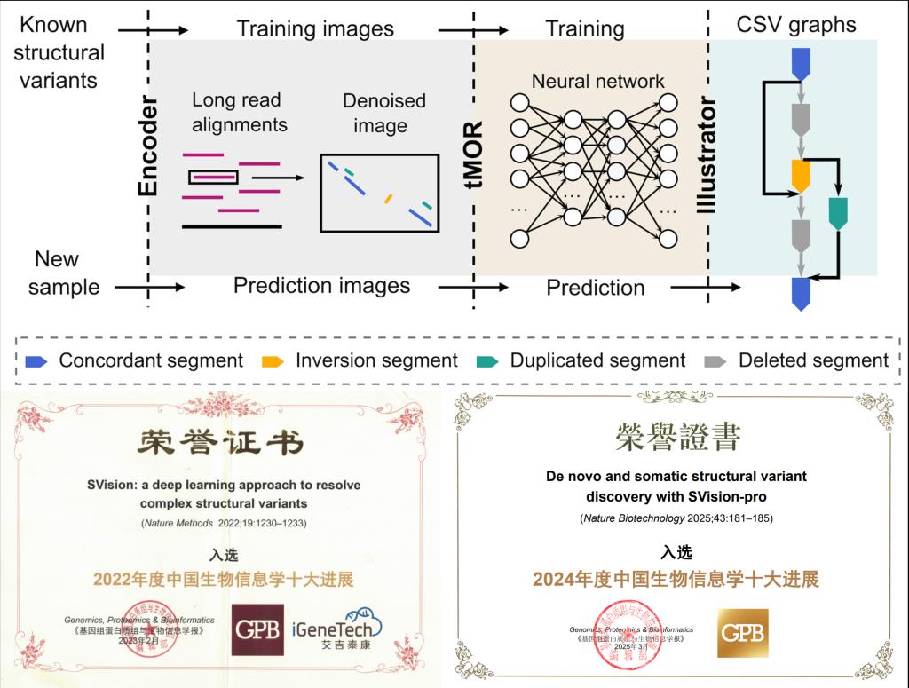 叶凯教授团队打破“还原主义”思想束缚,将基因组序列编码不同层面信息的多种类型问题统一到一个框架下进行分析,挖掘基因组序列多维信息内部的关联规律,提供一种新的思路和方法,推动基因组学研究的整体化、系统化和智能化的发展。基于此,团队自主开发了多个原创方法:智能基因注释系统ANNEVO,已被《Nature Methods》接收;复杂结构变异系列检测方案SVisionSVision-pro分别发表在《Nature Methods》及《Nature Biotechnology》。其中,SVision系列方案获得2022年度及2024年度中国生物信息学十大进展。