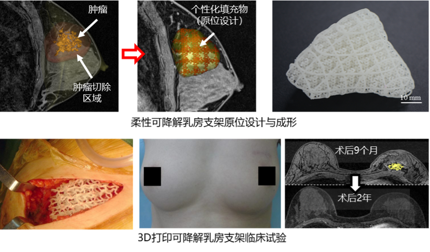 李涤尘、贺健康教授团队研发的3D打印可降解软组织植入物在甲乳外科、胸外科、泌尿外科等领域开展临床试验。完成了国际首例可降解乳腺支架、可降解气管外支架、肾袋网兜等的临床应用,被CCTV7、CCTV10、新华社、人民日报、科技日报、陕西人保等多家媒体多次专题报道,获得教育部自然科学一等奖、中国好设计银奖,孵化创新型医疗器械企业1家。